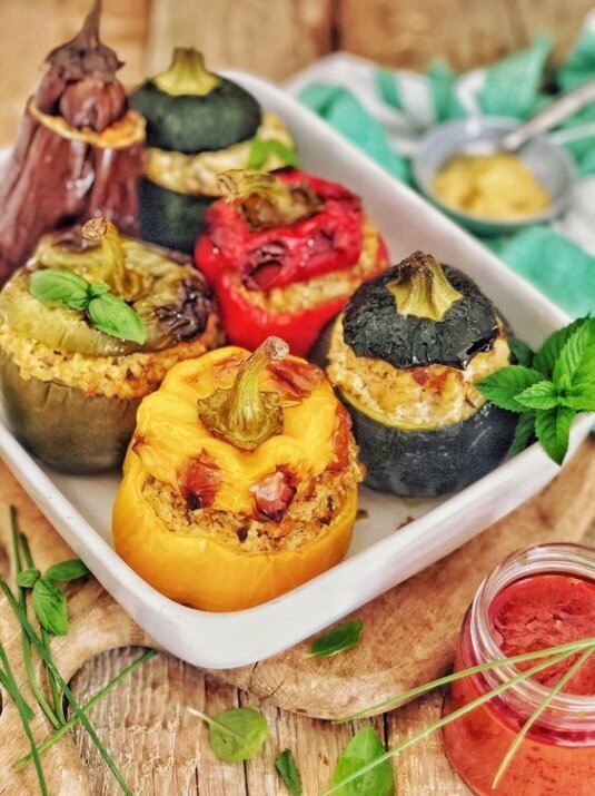 Voici Si une version végétarienne des petits farcis provençaux. Dans cette recette, les tomates, les courgettes et les oignons sont garnis d'une farce à base de quinoa, de légumes, de pistaches et de pignons de pin. Une alternative sans viande tout aussi savoureuse !
